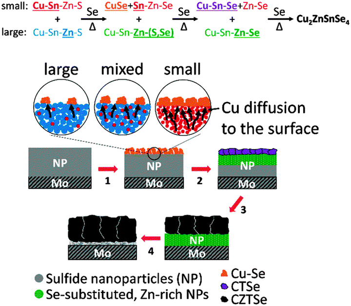 Small (∼5 nm), Cu- and Sn-rich nanoparticles play a key role in initiating the growth of micrometer-sized Cu 2 ZnSn(S,Se) 4 grains. , Real-time energy dispersive X-ray diffraction (EDXRD) analysis has been utilized to observe the selenization of Cu–Zn–Sn–S nanoparticle films coated from three nanoparticle populations: Cu- and Sn-rich particles roughly 5 nm in size, Zn-rich nanoparticles ranging from 10 to 20 nm in diameter, and a mixture of both types of nanoparticles (roughly 1 : 1 by mass), which corresponds to a synthesis recipe yielding CZTSSe solar cells with reported total-area efficiencies as high as 7.9%. The EDXRD studies presented herein show that the formation of copper selenide intermediates during the selenization of mixed-particle films can be primarily attributed to the small, Cu- and Sn-rich particles. Moreover, the formation of these copper selenide phases represents the first stage of the CZTSSe grain growth mechanism. The large, Zn-rich particles subsequently contribute their composition to form micrometer-sized CZTSSe grains. These findings enable further development of a previously proposed selenization pathway to account for the roles of interparticle heterogeneities, which in turn provides a valuable guide for future optimization of processes to synthesize high quality CZTSSe absorber layers.