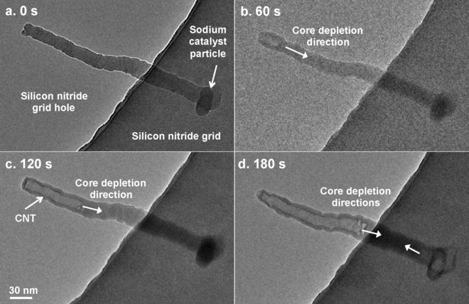 Synthesis of low-dimensional carbon nanomaterials such as carbon nanotubes (CNTs) is a key driver for achieving advances in energy storage, computing, and multifunctional composites, among other applications. Here, we report high-yield thermal chemical vapor deposition (CVD) synthesis of CNTs catalyzed by reagent-grade common sodium-containing compounds, including NaCl, NaHCO3, Na2CO3, and NaOH, found in table salt, baking soda, and detergents, respectively. Coupled with an oxidative dehydrogenation reaction to crack acetylene at reduced temperatures, Na-based nanoparticles have been observed to catalyze CNT growth at temperatures below 400 °C. Ex situ and in situ transmission electron microscopy (TEM) reveal unique CNT morphologies and growth characteristics, including a vaporizing Na catalyst phenomenon that we leverage to create CNTs without residual catalyst particles for applications that require metal-free CNTs. Na is shown to synthesize CNTs on numerous substrates, and as the first alkali group metal catalyst demonstrated for CNT growth, holds great promise for expanding the understanding of nanocarbon synthesis.